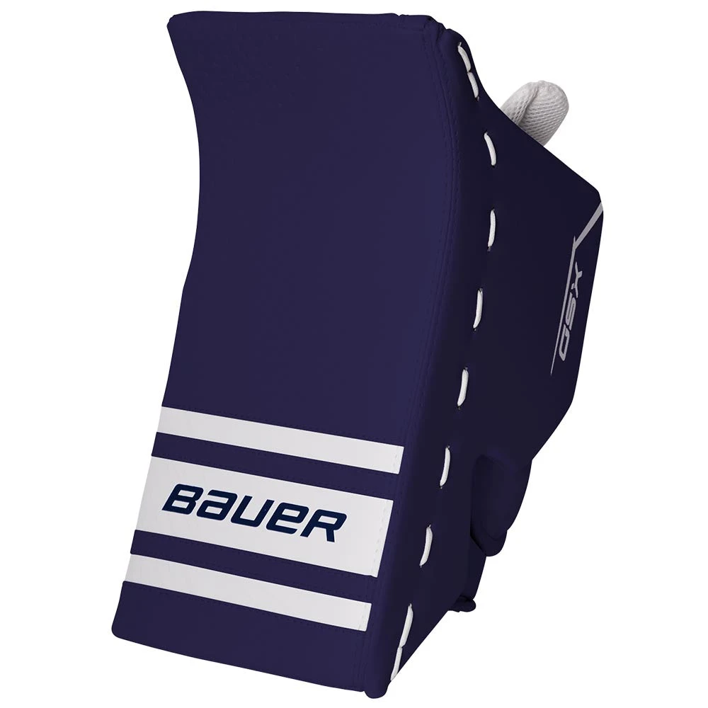 The Bauer GSX Goalie Blocker Intermediate is for the rec goalie. It features the flex cuff of Vapor with the coverage of Supreme, and now has new player dimension palms— allowing for better feel and connectivity.